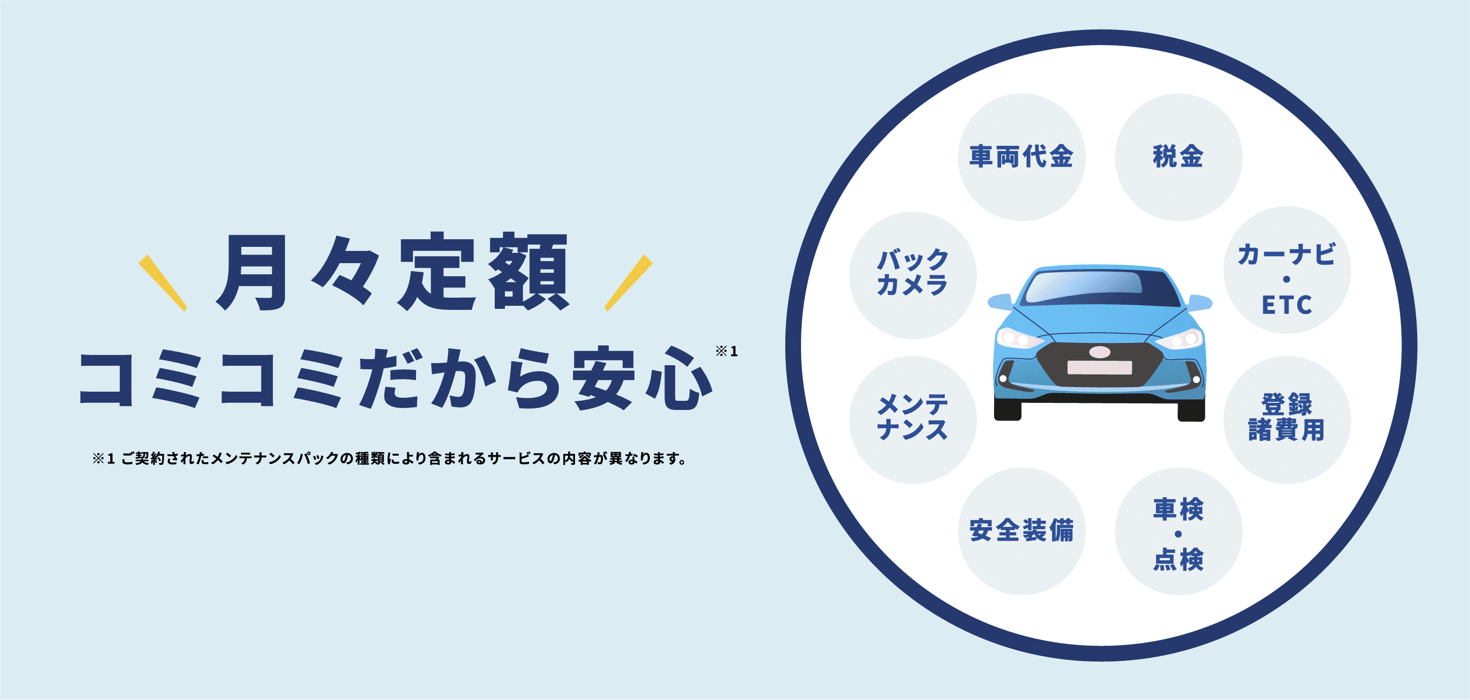 リース期間中(1年〜最長11年まで)にかかる費用(税金・車検※1・保険)やディーラーオプションから希望通りの一台をまとめて月々定額でお支払いいただくプランとなります。